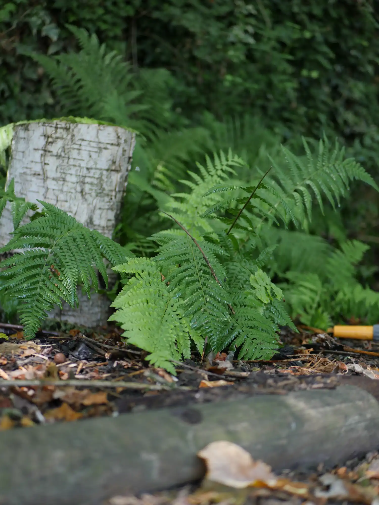 - August–September: Painted Ferns turn bronze. Royal Ferns add height and volume — this is when the stumpery comes alive.
